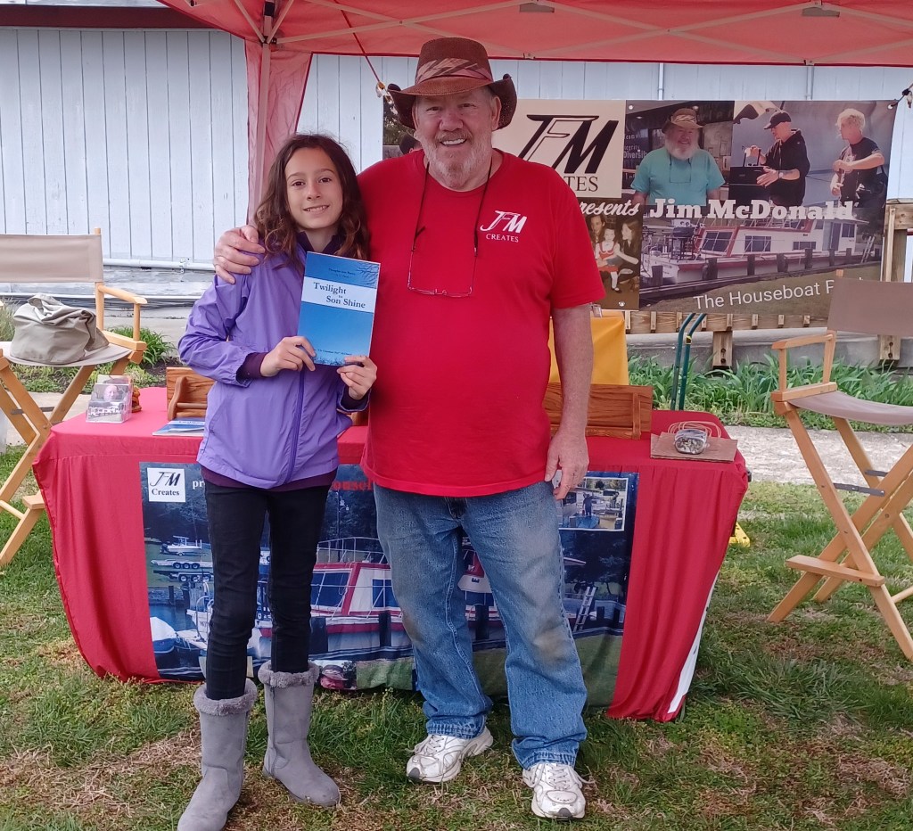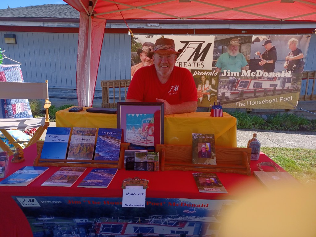 For those of you that might not know, I am Jim “The Houseboat Poet” McDonald and have three books of poetry that tell the story of my life, one book about hats and one book of word prompts. I also have a few hats, shirts, coffee mugs, and photos.